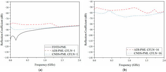 The reflection coefficient obtained by different PML algorithms and CFLNs at the observation point in the frequency domain (a) FDTD-PML, ADI-PML and CNDS-PML with CFLN = 1. (b) FDTD-PML, ADI-PML and CNDS-PML with CFLN = 16.