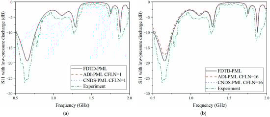 S11 parameter with low-pressure discharge obtained by different PML algorithms and CFLNs in the frequency domain (a) FDTD-PML, ADI-PML and CNDS-PML with CFLN = 1. (b) FDTD-PML, ADI-PML and CNDS-PML with CFLN = 16.