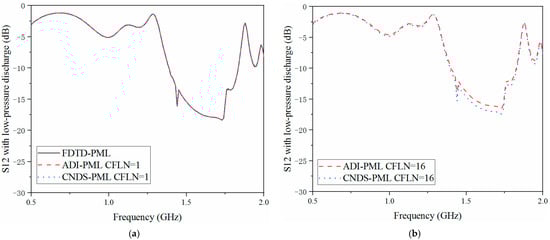 S12 parameter with low-pressure discharge obtained by different PML algorithms and CFLNs in the frequency domain (a) FDTD-PML, ADI-PML and CNDS-PML with CFLN = 1. (b) FDTD-PML, ADI-PML and CNDS-PML with CFLN = 16.