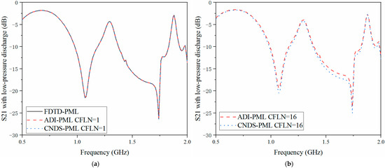 As shown in Figure 7a, the curves are almost overlapped with CFLN = 1. This condition indicates these algorithms hold the same calculation accuracy during the entire frequency simulation. With the increment of CFLN and time step, curves obtained by implicit algorithms show shifting compared with these algorithms with CFLN = 1. This condition indicates a decrement in calculation accuracy due to the increment of numerical dispersion. Among implicit algorithms, the proposed CNDS-PML algorithm shows better performance compared with the implicit ADI-PML algorithm, shown in Figure 7b. As can be demonstrated from the experiment results, it shows considerable agreement with the simulation method. The condition shows the effectiveness of the proposed algorithm in the simulation of the low-pressure discharge phenomenon. Figure 8 and Figure 9 show the S12 and S21 parameters obtained by different PML algorithms and CFLNs in the frequency domain with low-pressure discharge phenomenon, respectively.