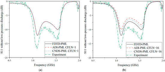 As shown in Figure 8a and Figure 9a that these curves are almost overlapped with CFLN = 1. This condition indicates they hold a similar accuracy with lower CFLNs. Through Figure 8b and Figure 9b, it can be observed that the curves show shifting compared with those with CFLN = 1 due to the enlargement of numerical dispersion and decrement of numerical accuracy with larger CFLNs. However, the proposed algorithm can still receive considerable performance with larger CFLNs. Meanwhile, it still shows considerable performance compared with existed implicit ADI-PML algorithm. Figure 10, Figure 11 and Figure 12 demonstrate the electrical behavior without low-pressure discharge, which can be regarded as filled with a vacuum at the rest of the computational domain. It can be observed that the scattering parameters show significant variation with the occurrence of the low-pressure discharge phenomenon. The occurrence of low-pressure discharge significantly affects the entire electrical behavior in the entire frequency band. Such a condition results in the failure of the satellite sensors system in outer space. Meanwhile, experiment results of the S11 parameter without the low-pressure discharge phenomenon are also considered. It can be observed that the simulation and experiment results show considerable agreement. The condition demonstrates that the proposed algorithm is efficient in practical engineering.