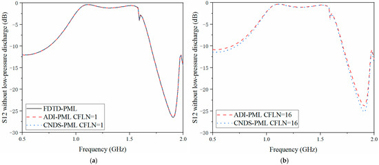 S12 parameter without low-pressure discharge obtained by different PML algorithms and CFLNs in the frequency domain (a) FDTD-PML, ADI-PML and CNDS-PML with CFLN = 1. (b) FDTD-PML, ADI-PML and CNDS-PML with CFLN = 16.