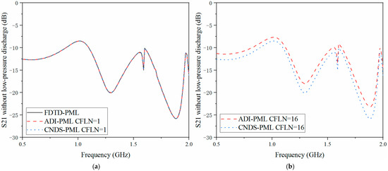 S21 parameter without low-pressure discharge obtained by different PML algorithms and CFLNs in the frequency domain (a) FDTD-PML, ADI-PML and CNDS-PML with CFLN = 1. (b) FDTD-PML, ADI-PML and CNDS-PML with CFLN = 16.