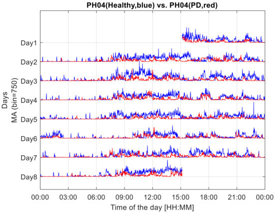 Seven-day profiles of MA, Motor Activity indices, computed in 1-min epochs from the recordings of the two components of a couple, the experimental dyad. The MA profile of the healthy component of the dyad is drawn in blue. That of the dyad component with Parkinson’s disease is drawn in red.