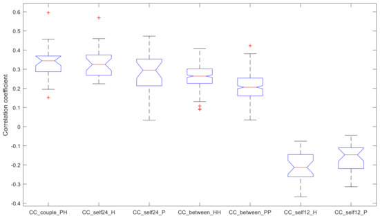 The design of the present data collection has some aspects which are replications of what was already reported in the 2022 article: some of the CC coefficient indices are fully comparable with some of the results presented in [47]: CC_self24H (0.325 vs. 0.335, respectively, −3%), CC_between_HH (0.264 vs. 0.277, −5%), and CC_self12H (−0.213 vs. −0.203, +5%). Such comparable figures ensure that the present data set is consistent and can be compared to the already published data set [47] without biases or distortions.