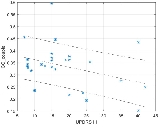 The CC (Figure 4) and AR (Figure 5) values of the within-couple correlation “CC_couple_PH” group are presented along with the degree of impairment of the dyad component with PD, as quantified by the UPDRS III score. The scatterplots reported below were completed by the linear regression interpolation line, with 95% confidence intervals. It is apparent that the within-couple correlation CC_couple_PH tends to decrease with the increase of UPDRS III (i.e., greater clinical impairment), and that the within-couple asymmetry AR tends to increase with the increase of UPDRS III.