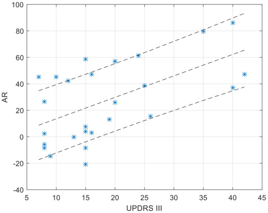 Values of AR_couple_PH as a function of the UPDRS score of the dyad component with PD. The regression function is completed by its 95% confidence interval. A positive AR value (up to a max of 100%) denotes larger values in the MA profile of the healthy dyad component.