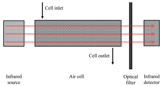 NDIR gas measurement falls into the category of optical sensors. This is an application of infrared spectroscopy. The NDIR technique for gas measurement aims at absorbing wavelengths in the infrared spectrum as a way to identify particular gases [36]. A simple NDIR gas sensor consists of an infrared emitter, a detector, an optical filter, a gas cell and circuit elements for signal processing [37,38]. The operation of this type of sensor is shown in Figure 1.