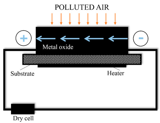 Additionally, there are sensors based on metal oxide semiconductors (MOS). The detection principle of semiconductor-type sensors is based on the change of the electrical resistance of the MOS, depending on the composition of the gaseous atmosphere [56,57]. The schematic of this type of sensor is shown in Figure 3.