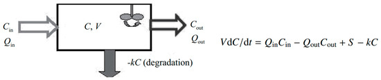 Schematic diagram of a fully mixed box model. Cin, C and Cout are concentrations of the monitored gas in the inflow, indoor air and outflow, respectively, Qin, Qout are air flows into/out of the building/space V is room volume [32].