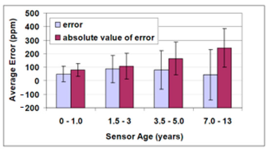 Error from single-concentration calibration checks and multi-concentration calibration challenges at 510 ppm plotted versus sensor age. The error bars represent one standard deviation in the error [91].