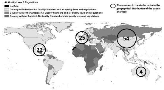 Map indicating global air quality laws and geographical distribution of studies [15].