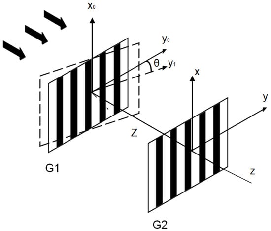 As shown in Equations (1) and (4), the period of the amplitude distribution was identical to the period of G1 as θ = 0°. As θ ≠ 0°, the period of the amplitude distribution changed. At the same time, the Talbot planes twisted with a same angle of θ. As a result, a transversal shift of the Talbot images was induced.