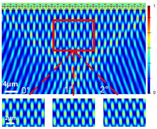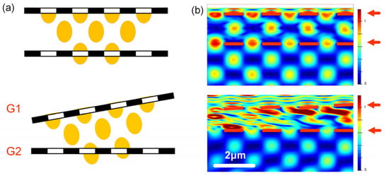 As shown in Figure 4, transmissions of the two-grating structure with different pitch angles were obtained. In the case where θ = 0°, most of transmitted light from G1 went through G2, leading to a relatively high total transmission. In contrast, as θ = 2°, the transmitted light from G1 was blocked by G2, resulting in a significant decrease in the total transmission.