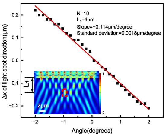The relationship between the transversal shift of the Talbot images and the pitch angle was investigated in a simulation. As shown in Figure 3, the center of one Talbot image, which is indicated by the red dotted line inside the figure, shifted linearly along the x direction as the pitch angle changed from −2° to 2°. A slope of −0.114 μm/degree and a standard deviation of 0.0018 μm/degree were obtained.