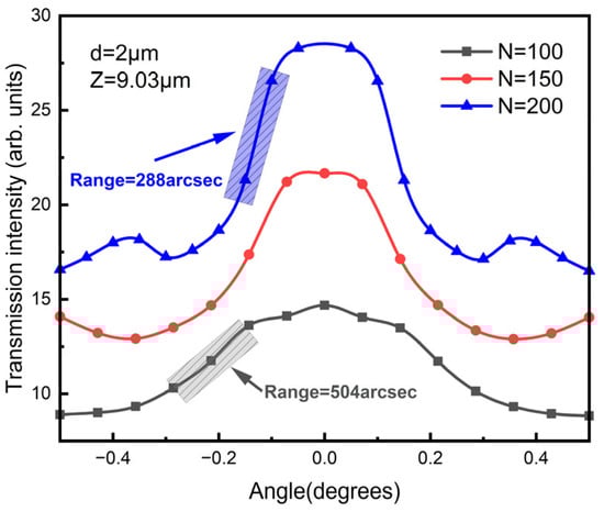 Figure 6 shows the simulated results of transmission intensity with different numbers of grating lines (N). The distance Z was set to be 9.03 µm to guarantee an input angle up to ±0.5° as well as a relatively high sensitivity. The simulated results showed that the relative sensitivity changed from 0.23%/arcsec to 0.34%/arcsec as the number of grating lines increased from 100 to 200. At the same time, the range (defined as the linear fitting within which R2 > 99%) of the angle measurement decreased from 504 arcsec to 288 arcsec. As the number of grating lines increased, the relative sensitivity increased with a decreased detection range.