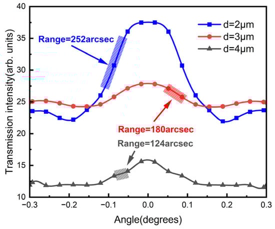 Simulated transmission intensity with different grating periods in which d = 2 µm, 3 µm and 4 µm, respectively.