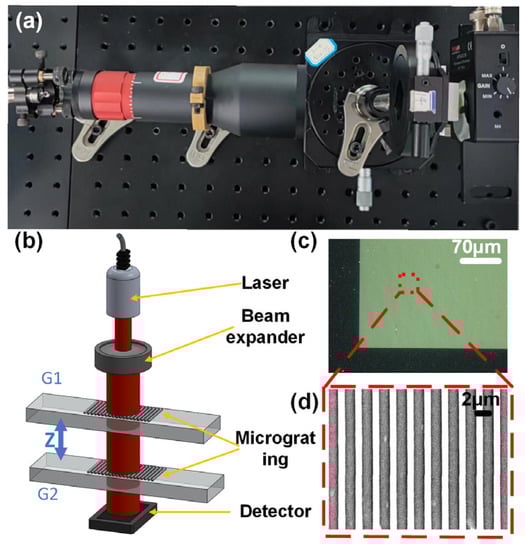 The experimental setup is shown in Figure 8a,b. The microgratings (shown in Figure 8c,d) used in the experiment were amplitude gratings made from Al, which were prepared by a lithography process. The thickness of the Al film and the SiO2 substrate was 150 nm and 500 μm, respectively. Gratings with periods of both 2 μm and 3 μm were used in the experiment.