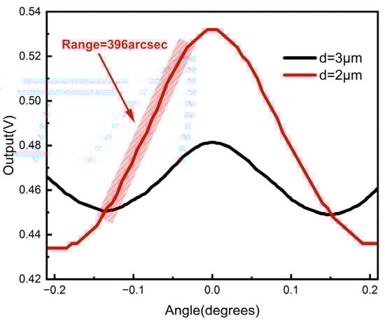 Figure 10 shows the experimental results with grating periods of 2 μm and 3 μm, respectively. Z was set to be 400 μm and 1020 μm, correspondingly. In the two cases, the lower grating was always located at the Talbot positions, which was in agreement with the simulation. The linear range in the 2 µm-period case was found to be 396 arcsec, which was 1.5 times greater than that in the 3 µm-period case. The results showed a good agreement with the simulated results, as shown in Figure 7.