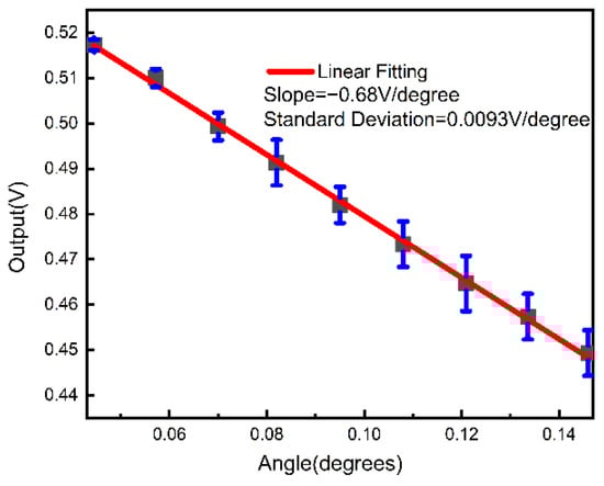 In the 2 μm-period case, a linear range was obtained within a range from 0.04° to 0.15°, as shown in Figure 11. An error within ±6 mV was obtained in the experiment. A slope of 0.68 V/degree and a standard deviation of 0.0093 V/degree were obtained by the linear fitting of the average experimental values. The sensitivity (k0) in an absolute unit (mV/arcsec) of the linear region was calculated to be about |−0.68 V/degree| = 0.68 V/3600 arcsec = 0.19 mV/arcsec. The relative sensitivity (k1) could be given by