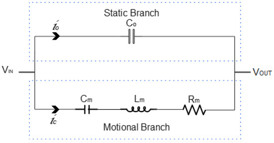 The used model for the electrical response is the Butterworth–Van Dyke model [49], with lumped element parameters, as shown in Figure 2, where the lumped element parameters of the equivalent circuit are the inductance ( ), resistance (), and capacitance (), which form the motional arm of the circuit. Parallel capacitance forms the parallel arm of the circuit and is equivalent to the static capacitance of the piezoelectric patch between the electrodes.