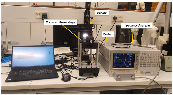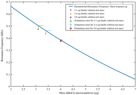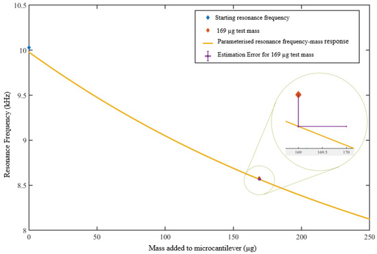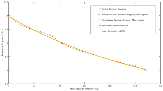 A microcantilever provided by Fraunhofer ISIT with the same dimensions as those used in the analytical model formulation and with a measured resonance frequency of kHz was used. The impedance and phase response were measured using an Agilent 42941A precision impedance analyzer [58] with a measurement tolerance of ±3.0 Hz. The impedance analyzer was set to use the Butterworth–Van Dyke equivalent circuit model, with a driving source voltage of 1 V. The impedance analyzer was set to use the Butterworth–Van Dyke equivalent circuit model, with a driving source voltage of 1 V. For ease of reading, we use the term “calibration” to mean the application of known masses to obtain a resonance frequency response that is later used to develop the response polynomial.