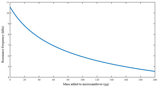 Simulated polynomial-like microcantilever resonance frequency response to the mass added, for the modeled piezoelectrically driven microcantilever beam.