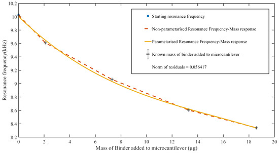 This study aims to demonstrate that by parameterizing the resonance frequency response to the mass added of a complete piezoelectrically driven microcantilever-based sensor system into a polynomial of the form: