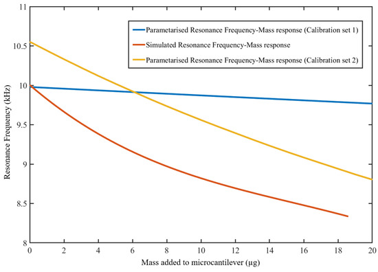 Comparison of simulated resonance frequency-mass response to parameterised response from calibration set-1 and calibration set-2.