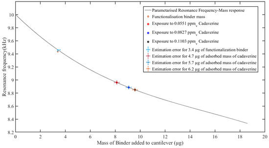 Consequent to the performance of the response polynomial from calibration set-2, it was then used to estimate the mass of the adsorbed cadaverine on a functionalized microcantilever in different cadaverine concentrations. There was a reduction in the microcantilever response resonance frequency, with an increase in concentration. The estimated masses were 4.7 g, 5.7 g, and 6.2 g for the 0.0551, 0.0827, and 0.1103 calculated concentrations of cadaverine, with resonance response frequencies of 8.9618 kHz, 8.8833 kHz, and 8.8520 kHz, respectively. These results are withing the assumption that there is no desorption and that the interaction between the binder and adsorbed cadaverine molecules has a negligible effect on the viscosity of the binder. The change in the binder viscosity influences the overall surface stress, subsequently affecting the resulting resonance frequency. The estimated mass of the adsorbed cadaverine is in micrograms, which can be deemed high for a gas. However, it is important to note that synthetic cadaverine was used. The cadaverine has a molecular weight of 102.18 g/mol and a settling density of 870 kg/mol [65]. Despite the fact that the cadaverine is a volatile gas, it crystallizes when exposed to air and forms heavy particles. This made it possible to estimate the mass of the adsorbed cadaverine since the polynomial was developed using masses in the order of micrograms. For an accurate response in nanograms or picograms, it is imperative that known masses (in the order of target masses for the estimation) be used for developing the resonance frequency to the added mass response polynomial.