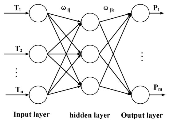 The BP neural network [,,] is a multilayer feedforward neural network, and its topology is shown in Figure 6. The main feature of this network is that the signal is transmitted forward and the error is propagated backward. In forward transmission, the input signal is processed from the input layer through the implicit layer to the output layer. The neuron state in each layer only affects the neuron state in the next layer, and if the desired output is not obtained in the output layer, it is transferred to backpropagation, and the weights and thresholds of the network are adjusted according to the prediction error so that the predicted output of the BP neural network continuously approximates the desired output [,,].