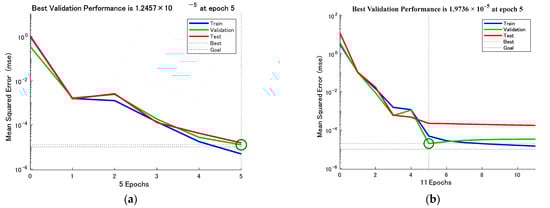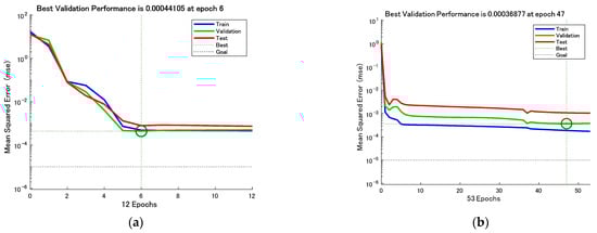 MSE variation curve for defect width prediction: (a) CSAPSO-BP algorithm; (b) PSO-BP algorithm.
