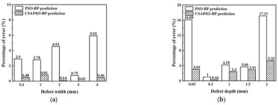 Figure 12a shows the error comparison between the two algorithms for the prediction of the defect width. It can be seen that the average error percentage of the PSO-BP neural network for predicting the defect width is 3.226%, while the average error percent-age of the CSAPSO-BP neural network for predicting the defect width is 0.382%, which is smaller than that of the PSO-BP neural network. Figure 12b shows the error percentage of defect depth prediction for both algorithms. the average error of PSO-BP neural network is 8.406%, while the average error of predicted depth of CSAPSO-BP neural network is 2.784%, which is more accurate than that of PSO-BP neural network. The above results show that the CSAPSO-BP neural network has less error and higher accuracy than the PSO-BP neural network in the prediction of defect depth and width, which proves the feasibility of the CSAPSO-BP neural network for quantitative identification of surface defects.