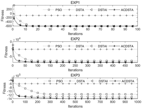 The maximum numbers of iterations of were set to 100, 500, and 1000, respectively. The remaining parameters were set as follows: PSO learning probability , initial population 120, inertia weight . The ACDSTA parameters were set to , , , , , and . The parameter settings of DSTA and DSTAI were the same as in Zhou et al.’s study [32].