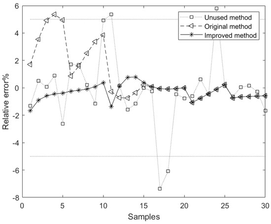 Table 3 shows the model evaluation indices based on the Unused, Original, and Improved methods, where the bold data are the optimal values, and the corresponding relative error curve is shown in Figure 5.