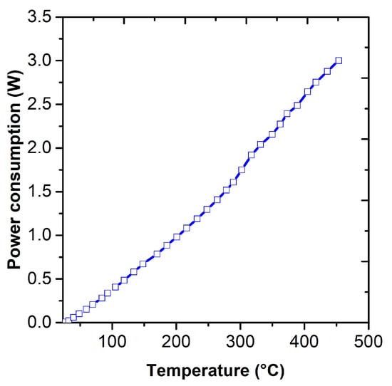 The sensor platform KBI2 Tesla Blatná a. s. was used for the study of polyaniline layers (Figure 1). The sensor platform was fabricated by sputtering a thin layer of platinum on a 6.2 mm × 5.25 mm ceramic substrate (Al2O3), followed by laser trimming to form the structures of the interdigital electrodes, temperature sensor (Pt1000), and heating element. The temperature sensor and the heating element were passivated by an insulating glass layer. Sensitive layers can be deposited on interdigital electrodes by various techniques, such as printing, dipping, screen printing, or immersion. In our study, we used the technique of dipping in a polymerization solution. The temperature element allows a constant temperature to be maintained or performs thermal cycling up to 450 °C. The power consumption as a function of temperature can be seen in Figure 2. At 450 °C, a sensor’s power consumption is 3 W.