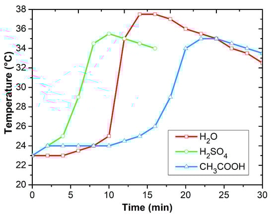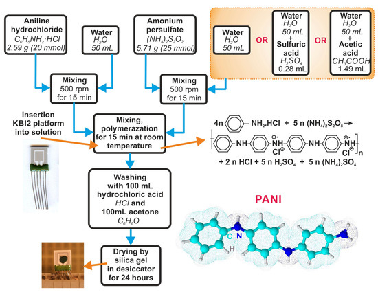 The sensor platforms were cleaned with acetone and isopropyl alcohol for 15 min prior to the deposition of the sensing layer. At room temperature, 0.2 M aniline hydrochloride was oxidized with 0.25 M ammonium persulfate to produce polyaniline in the form of protonated emeraldine salt (Figure 3). This method was described in [9]. The polymerization was performed in different polymerization solutions: (i) aqueous solution, (ii) sulfuric acid solution, and (iii) acetic acid solution. Since polyaniline synthesis is an exothermic process, the temperature of the reaction mixture was monitored. The effect of temperature on PANI polymerization time is shown in Figure 4. The process of polymerization was finished at 37 °C within 15 min for the aqueous solution, at 36 °C within 10 min for the sulfuric acid solution, and at 35 °C within 25 min for the acetic acid solution. Before drying the sensors on a hotplate at 60 °C for 2 h and then by silica gel in a desiccator for 24 h, they were purified using 0.2 M hydrochloric acid and acetone.