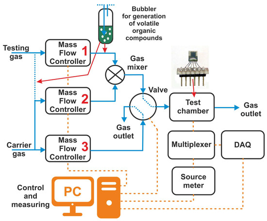 A measuring apparatus was designed for testing the gas sensors (Figure 5). The apparatus allows for the precise adjustment of gas concentrations using Bronkhorst mass flow controllers MFC1 to MFC3 (F-201DV-AAD-22-K in the range 10 mL–500 mL, F-201EV-AAD-22-K in the range 40 mL–2000 mL). Synthetic air (SA: 21% O2 and the rest N2) is used as a carrier gas, which also serves as a purging gas. The exact concentration of the test gas can be obtained by mixing it with the carrier gas or by diluting the saturated vapor of the desired solvent from the bubbler with dry air. This second method is mainly used to generate different concentrations of humidity and volatile compounds (ethanol, methanol, acetone, toluene, cyclohexane, etc.). The resulting mixture is then injected into the test chamber with the tested sensor. The volume of the test chamber is 50 mL. A Keithley 2400 sourcemeter was used to measure the resistance. A relay multiplexer is used to switch individual sensors, which is controlled by a National Instruments USB-6351 DAQ (Data Acquisition) device (16 analog inputs, 24 digital inputs/outputs, 2 analog outputs, maximum sampling rate 125 MS/s). The resistance values of the sensors are measured every 250 ms. The connection of the sensors between the multiplexer and the sourcemeter is performed using a coaxial cable to reduce interference from external electromagnetic fields. The VICI EUTA-4VL4MWE2 four-port two-way valve is used to switch the flow of gasses (test gas–purge gas) to ensure a rapid increase to the target concentration of the test gas, and to avoid the influence of overflows during switching. The apparatus and measurement process are controlled by the LabView application.