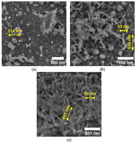 Scanning electron microscopy (SEM, TESCAN FERA3 GM) was used to analyze the surface morphology of the deposited active layers (Figure 6a–c). All active PANI layers have nanostructure morphologies, especially when polymerized in sulfuric acid solution and acetic acid solution. Polyaniline synthesized in an aqueous solution forms a granular form, while that synthesized in an acidic environment forms nanotubes. Polyaniline prepared in acetic acid exhibits the highest proportion of nanotubes.