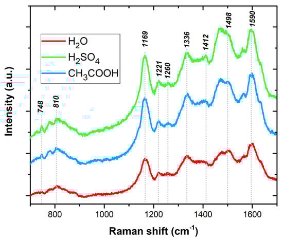 The PANI layers were also examined by Raman spectroscopy to confirm the deposited sensitive layers and their purity. Raman spectroscopy was performed at room temperature using a Renishaw inVia Qontor Raman spectrometer at a wavelength of 633 nm. The obtained spectra are shown in Figure 7. The spectrum of pristine PANI with main bands is described in Table 1 [23,24].