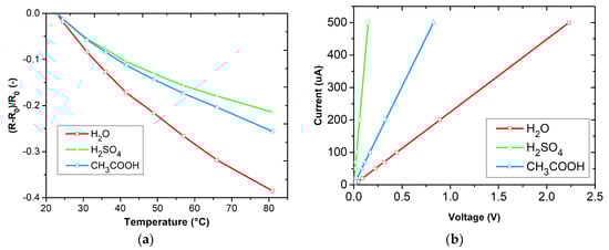 The temperature dependencies of the prepared layers are shown in Figure 8a. The average values of the temperature coefficients of resistance (TCR) can be determined according to: