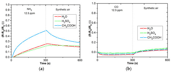 The DC analysis was performed due to the expected use of the sensors in applications working with a DC power supply and the possibility of simple evaluation. The electrical resistance was measured as a function of the time changes in the gas concentrations. Figure 9a–d shows the responses of PANI layers toward ammonia (12.5 ppm NH3), carbon monoxide (12.5 ppm CO), carbon dioxide (250 ppm CO2), and nitrogen dioxide (12.5 ppm NO2). The sensitive layers were also tested with volatile organic compounds (VOCs), 0.6% of acetone, 0.05% of toluene (Figure 10a,b), and toward humidity (Figure 11). Three cycles with the specified concentrations (5 min of exposure to the test gas, 5 min of synthetic air (SA) purging, flow rate 100 mL∙s−1) were performed during the testing. The measuring current was set to 10 μA to reduce the possibility of heating the layers.