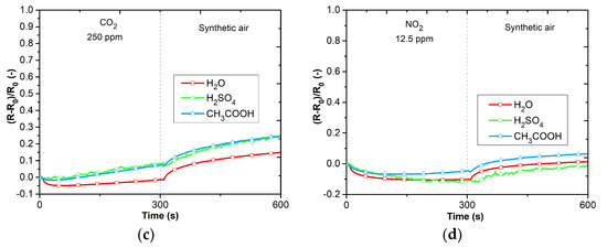 Responses of active layers: (a) reaction to NH3, (b) reaction to CO, (c) reaction to CO2, (d) reaction to NO2.
