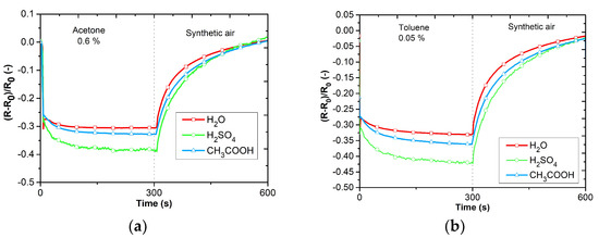 Responses of active layers toward VOCs: (a) reaction to acetone, (b) reaction to toluene.