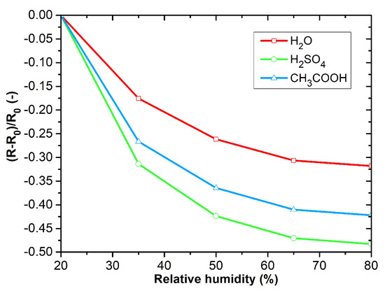 The active layers exhibit the highest sensitivity to ammonia (Figure 9a). Polyaniline polymerized in acetic acid exhibits the greatest sensitivity. The reactions to carbon monoxide, carbon dioxide, and nitrogen dioxide show low sensitivity (Figure 9b–d). Significant sensitivity can be observed to acetone, toluene, and humidity (Figure 10a,b and Figure 11). PANI layers exhibit a relatively fast response time to VOCs. Electrical resistance decreases with increasing relative humidity.