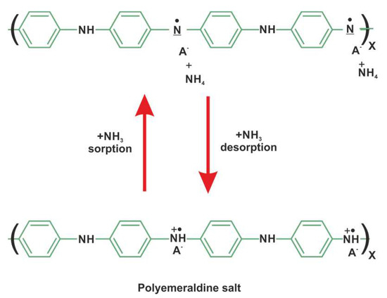 Ammonia is a gas generally detected by PANI layers because the nitrogen atoms of both compounds play a similar role in forming coordination bonds with protons. The deprotonation/protonation mechanism is used to explain the sensitivity and reversibility of the mineral acid-doped PANI layer to ammonia (Figure 12). The free nitrogen doublet of the ammonia molecule can form a coordination bond with the free atomic orbital of the donating proton. This reaction leads to the deprotonation of the polyaniline nitrogen atoms, involving the removal of charge carriers (polarons) and an increase in electrical resistance. Moreover, it may participate in the gas swelling reaction of the polymer [26].