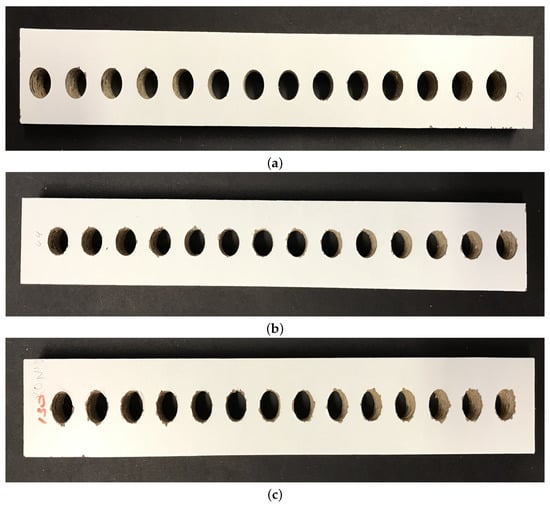 A total of 610 profiles were obtained from the laminated chipboard panel (Figure 2). Dimensions of each profile were 300 × 35 × 18 [mm], containing 14 holes in the central part, with equal distances. This ensured minimal influence of material tensions on the hole quality, and overall homogeneous work area. In the entire chipboard panel, a total of 8540 holes were prepared. In order to evaluate the drill state, it was regularly checked using the Mitutoyo microscope (model TM-500, Kawasaki, Japan). The drill could be assigned to one of three wear classes: