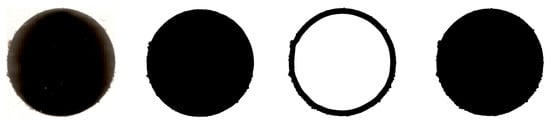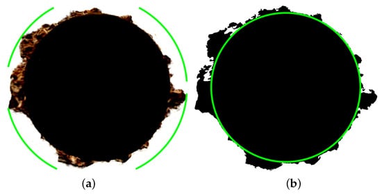 Further operations involved two-stage image conversion to black and white values, to accordingly point out the actual edge of the hole. The first of those methods involved standard conversion with the set threshold equal to 0.1. The second threshold was the basis for unifying the hole using the adaptive method. As a result, the exact outline of the hole was obtained (excluding center), without losing any data about edges or imperfections related to the laminate damage.