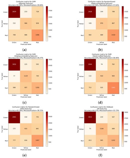 It can be clearly seen that the type of features obtained using different extraction methodologies has a significant impact on the final model accuracy. The difference between best and worst solution instances reached 11.14%. The same goes for the Red–Green misclassifications. The difference between best and worst classifiers reached a total of 321 errors (between approaches based on hand-crafted and all features).