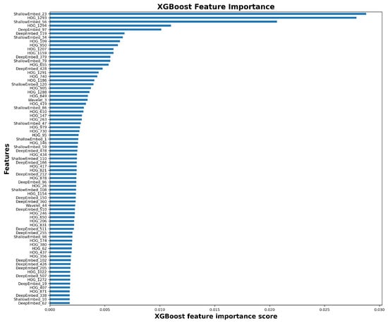 Since for most cases, the best results were obtained using set containing all extracted features, the following classifiers were tested using those results. The first of them was XGBoost, also used to evaluate importance of features from initial sets. Out of a total 1998 features, the XGBoost feature selection method chose 1109. Table 4 outlines the importance of the remaining features from each initial feature set. As can be seen, two of the most important sets with over 80% set share were obtained using deep embedding and HOG feature extraction approaches. The ranking of 75 of the most important features for the XGBoost algorithm is presented in Figure 7, while the confusion matrix is shown at Figure 5f. At Figure 7, it can be noticed that the main importance groups of features are deep embedding, shallow embedding and HOG. There is a significantly larger number of HOG features in comparison to the rest of the group. However, analyzing Table 4, it is clear that features having the greatest share and impact are the ones automatically extracted by the state-of-the-art deep learning algorithms.